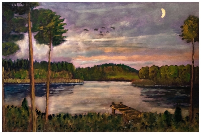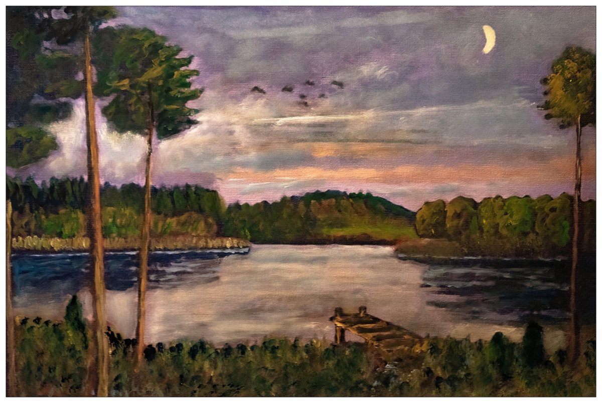 Sous un ciel violet où la lune s’effile comme une faucille de lumière, la rivière s’élargit en miroir tremblant.