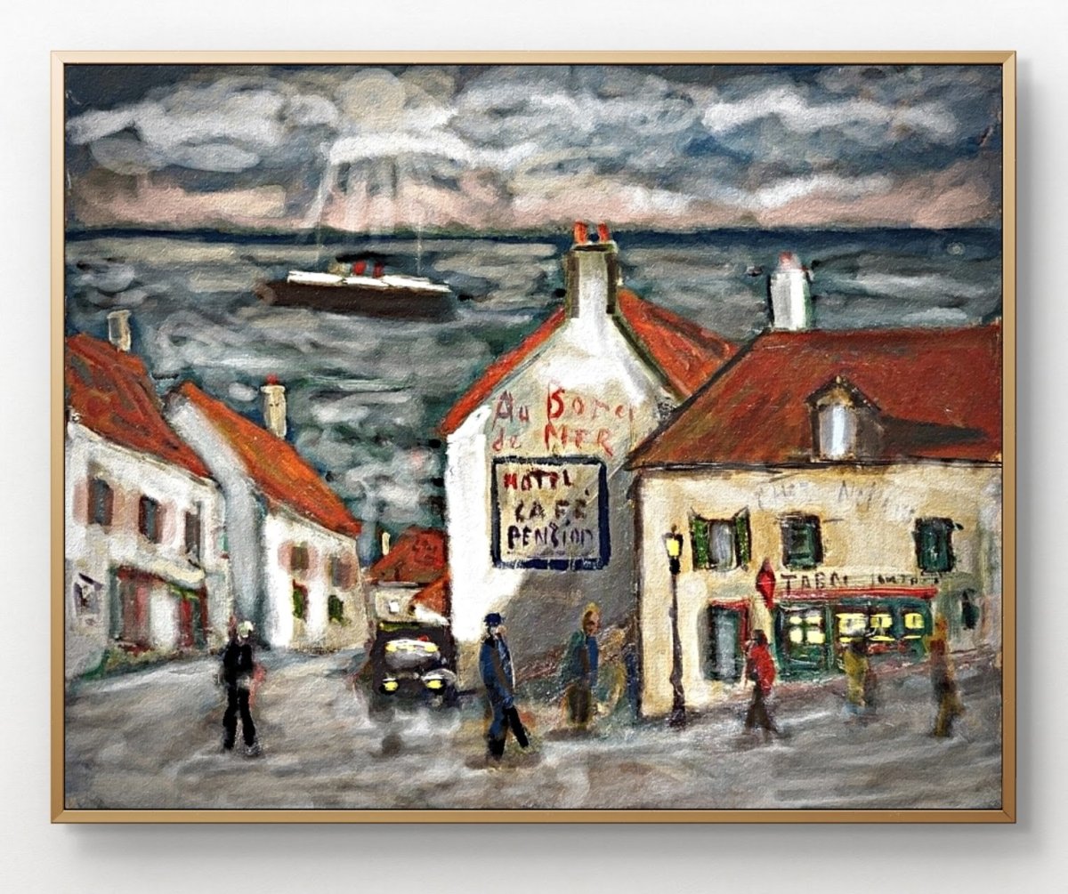 Une enseigne claque au-dessus d’une porte : Hôtel, Café, Pension — refuge de marins fatigués et de passants qui ignorent encore qu’ils cherchent quelque chose. Dans la ruelle, les silhouettes glissent, vacillent, ombres pressées sous le ciel craquelé de nuages.