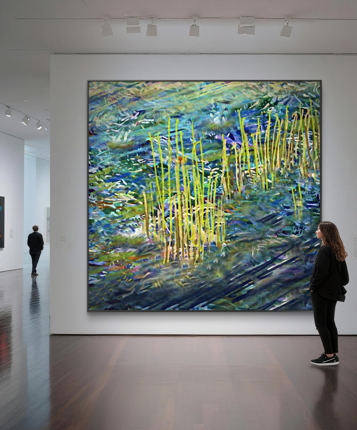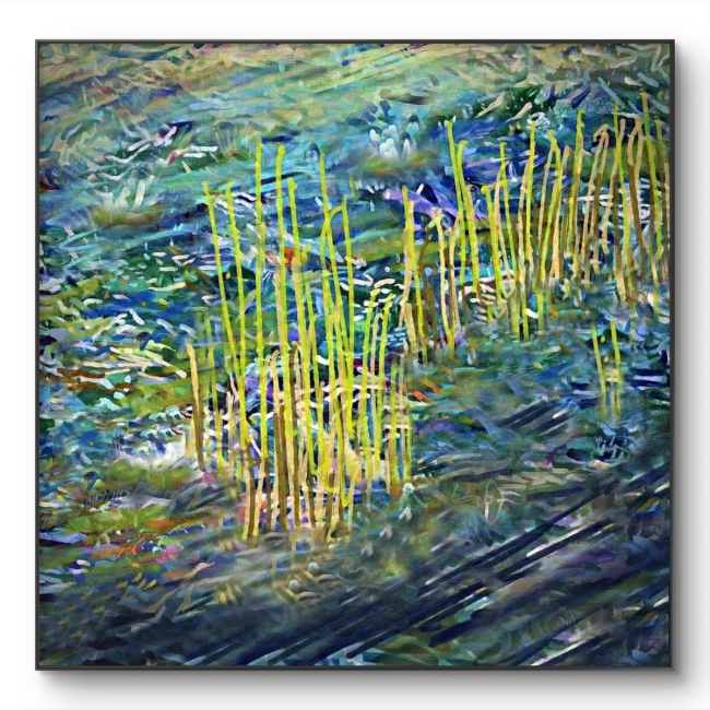À travers l’onde mouvante, un soupir de lumière s’élève. Les tiges jaunes — fines, indociles — traversent la surface comme des pensées soudain révélées.