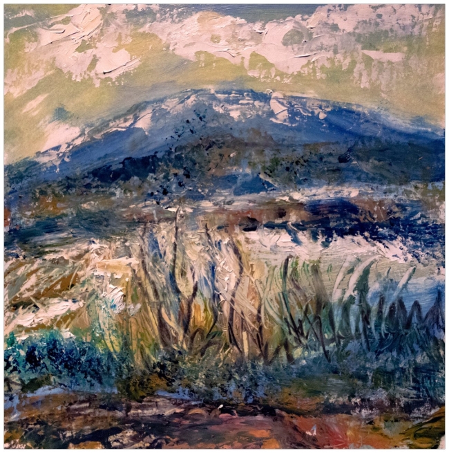 Au premier plan, les folles herbes montent en élans désordonnés, griffant l’air, vibrantes d’une vie rude et silencieuse, tandis que la terre sombre conserve la chaleur des jours passés.