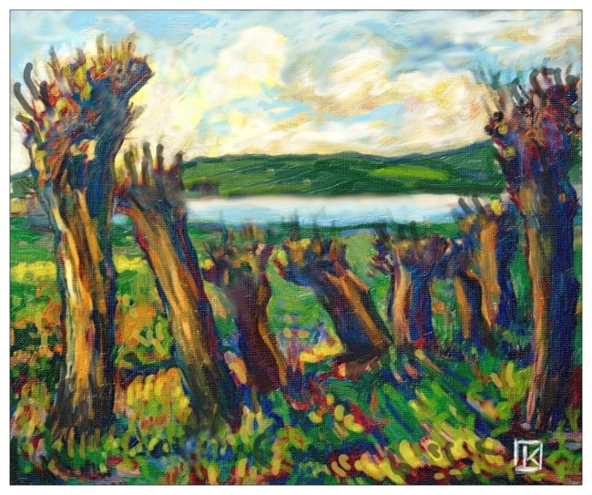 Sous la lumière oblique, les saules taillés dressent leurs bras noueux comme une procession d’anciens gardiens.