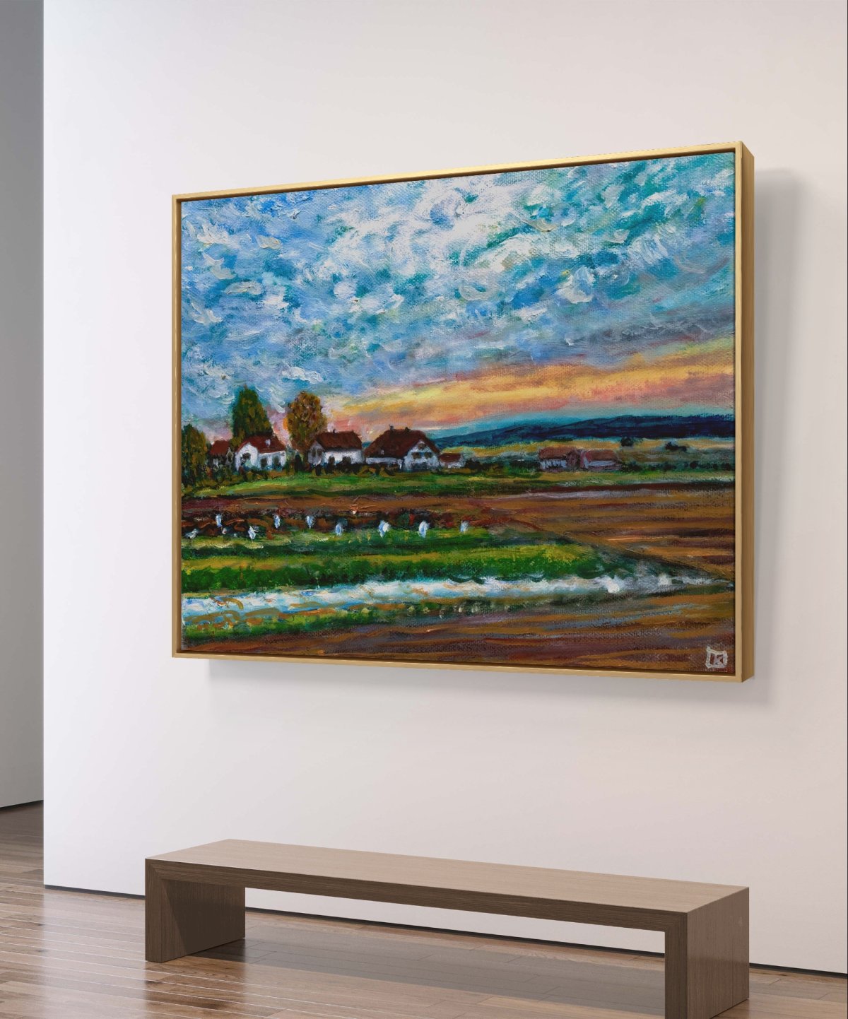 Les champs labourés s’étirent en larges bandes de terres humides, où l’aube dépose encore des reflets argentés.