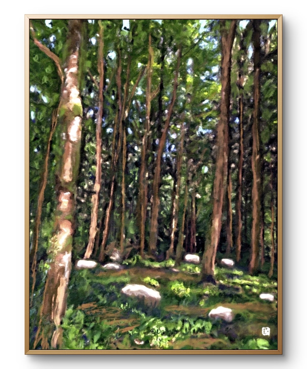 Dans le silence vert de la forêt, la lumière avance à pas feutrés. Elle glisse entre les troncs comme une confidence, effleure les pierres blanches posées là comme des pensées déposées par le temps.
