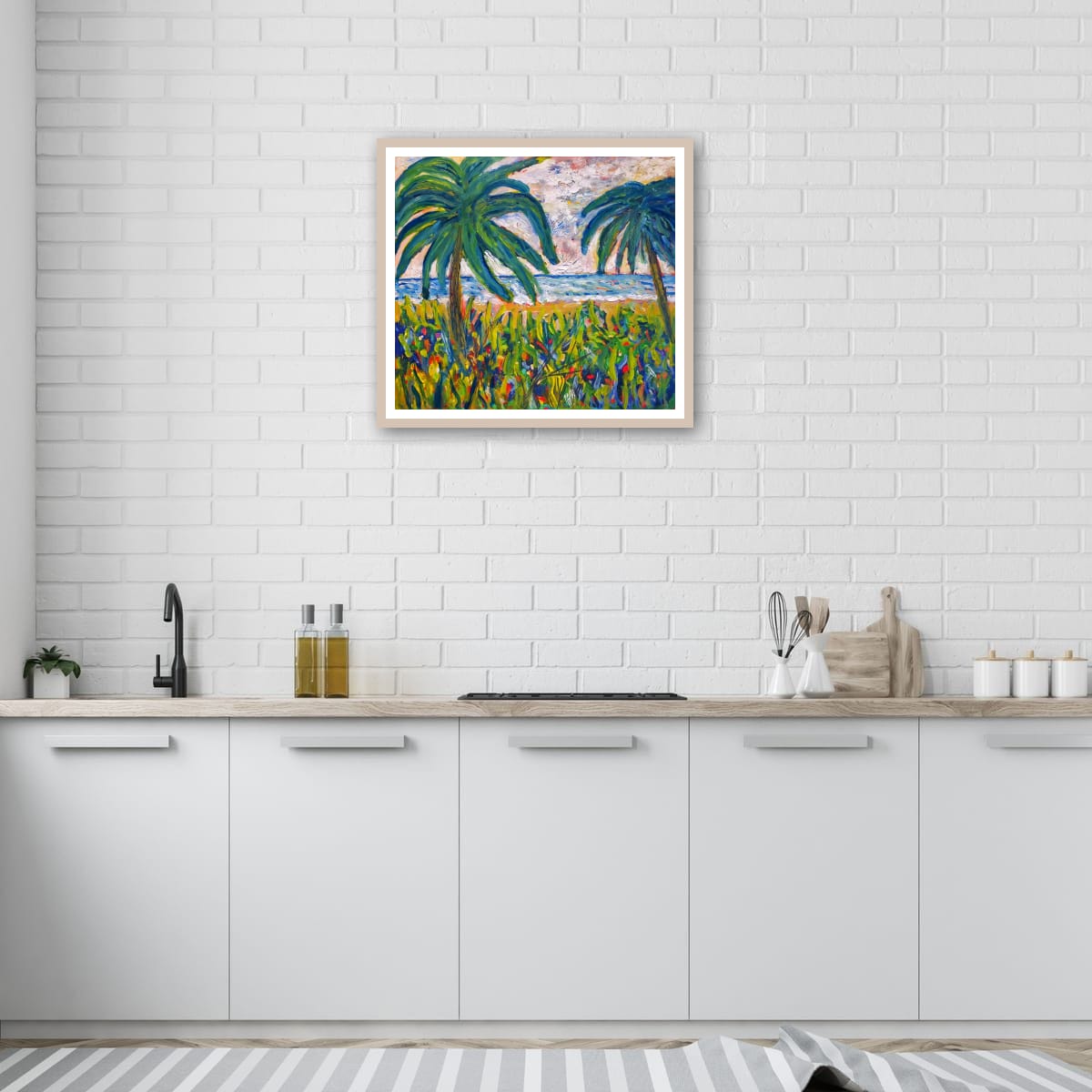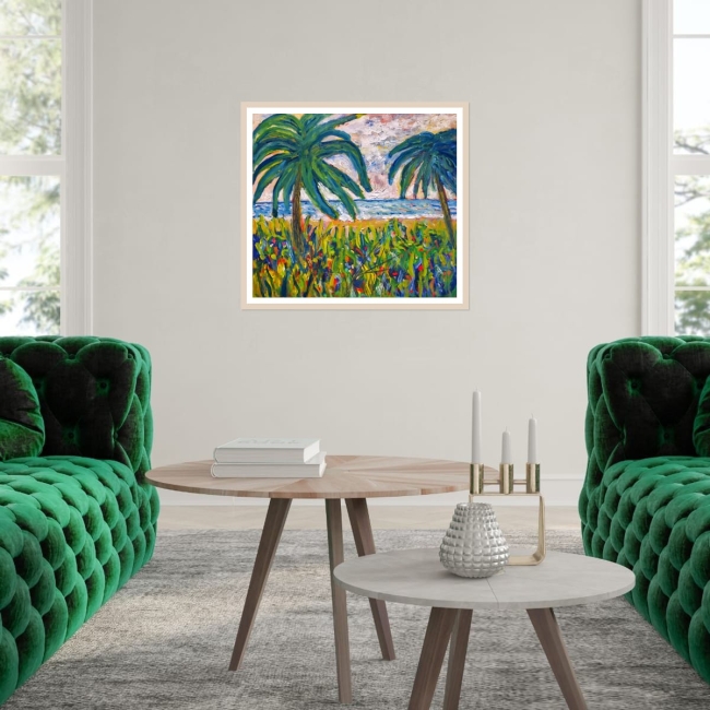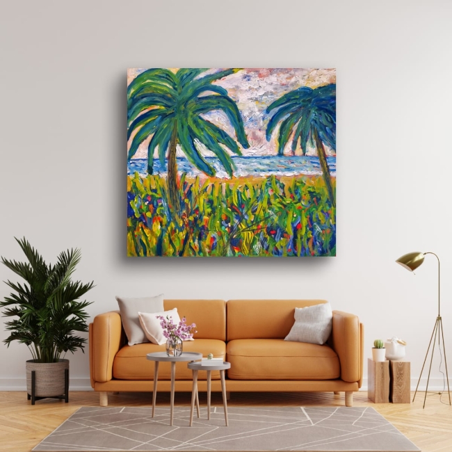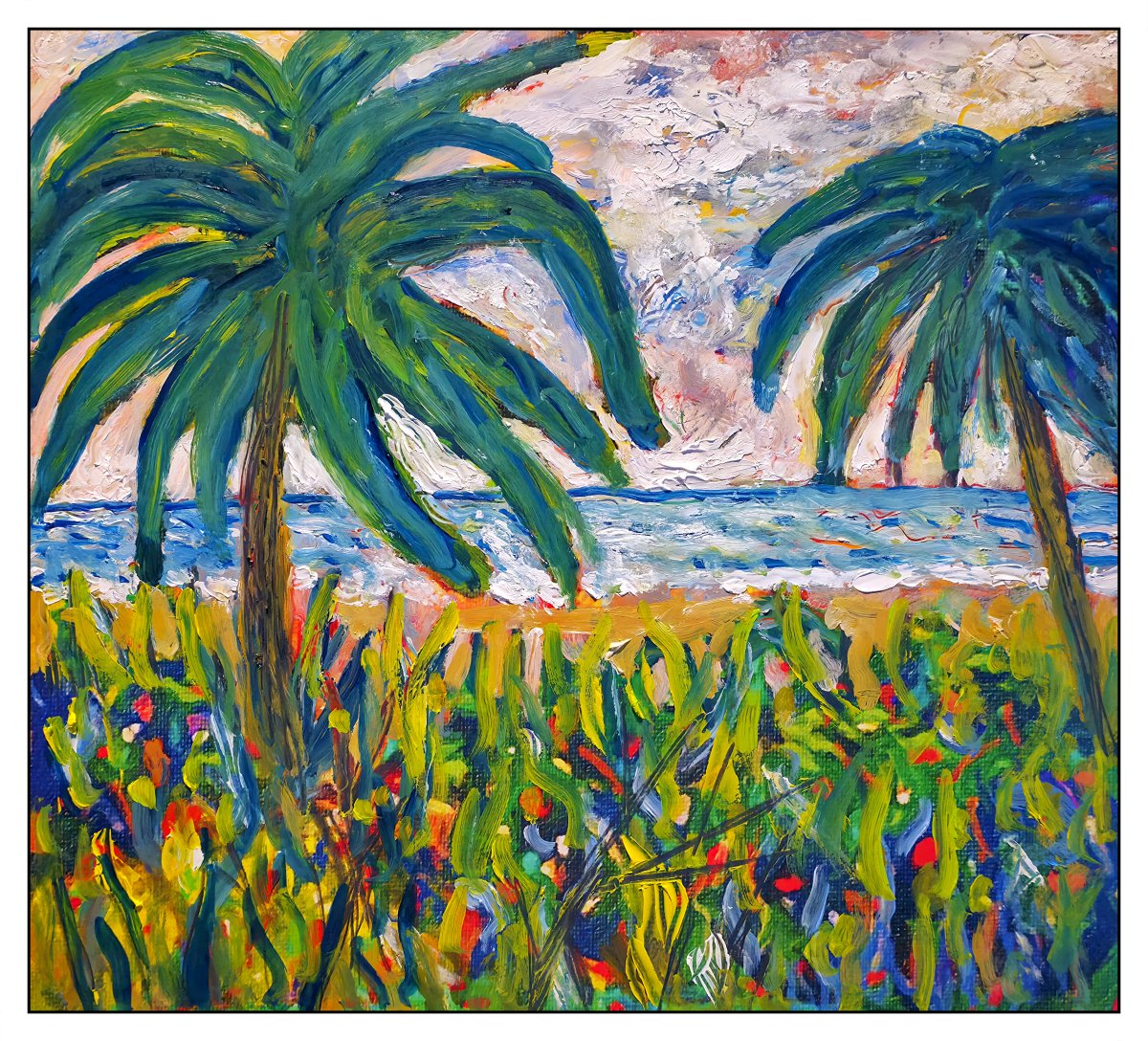 Cette œuvre explose de couleurs vives et vibrantes, évoquant un paysage tropical luxuriant. Deux grands palmiers aux feuillages denses dominent la scène, encadrés par un ciel tourbillonnant de bleu, de rose, de jaune et de violet.