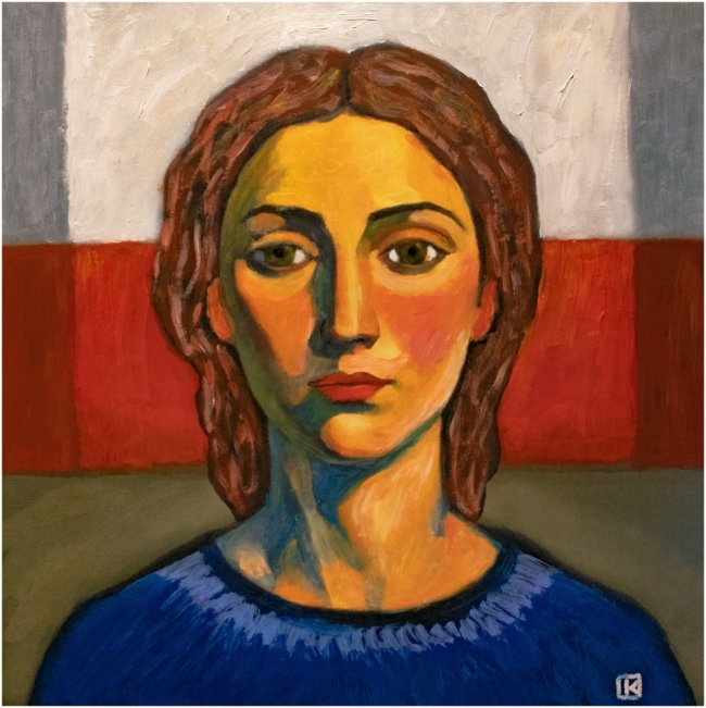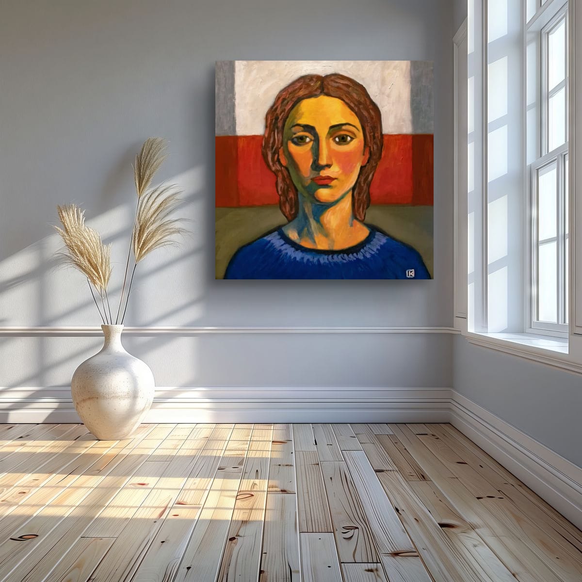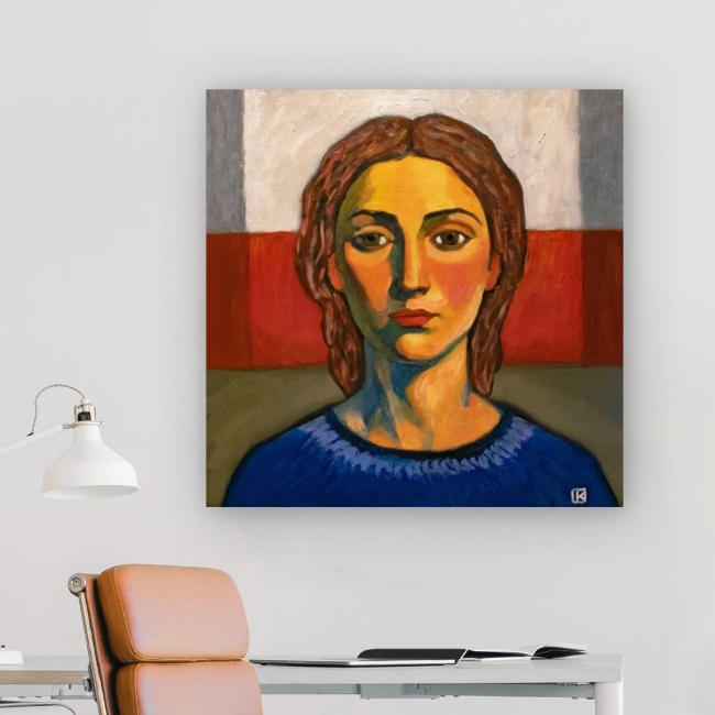 Son visage surgit de la toile comme une présence calme, posé entre lumière chaude et ombre profonde.