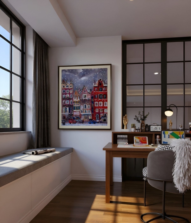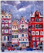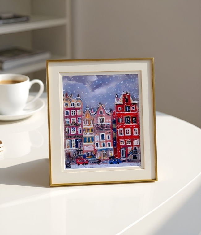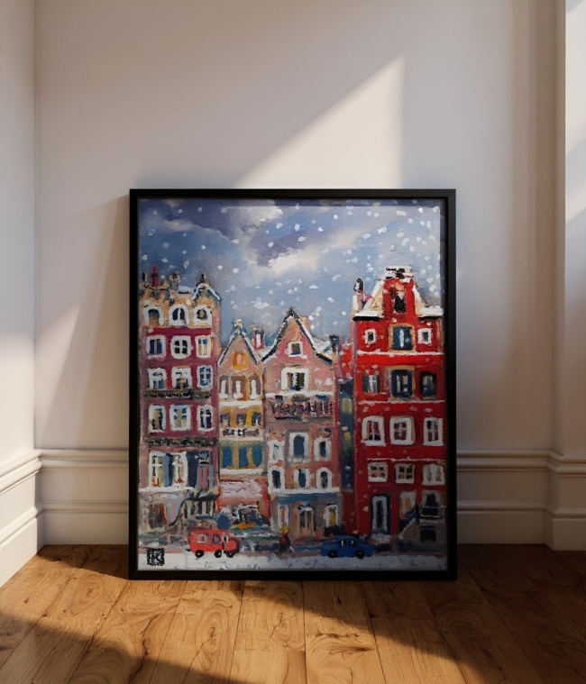 Les fenêtres, bordées de lumière, s’ouvrent sur des intimités invisibles, où l’on devine des rires, des mains autour d’un bol fumant. Dehors, la neige tombe lente, recouvrant les voitures d’un voile fragile. Un passant traverse la rue, minuscule silhouette dans ce théâtre gelé. La ville, soudain, devient tableau vivant : chaque flocon est une note, chaque couleur un accord.