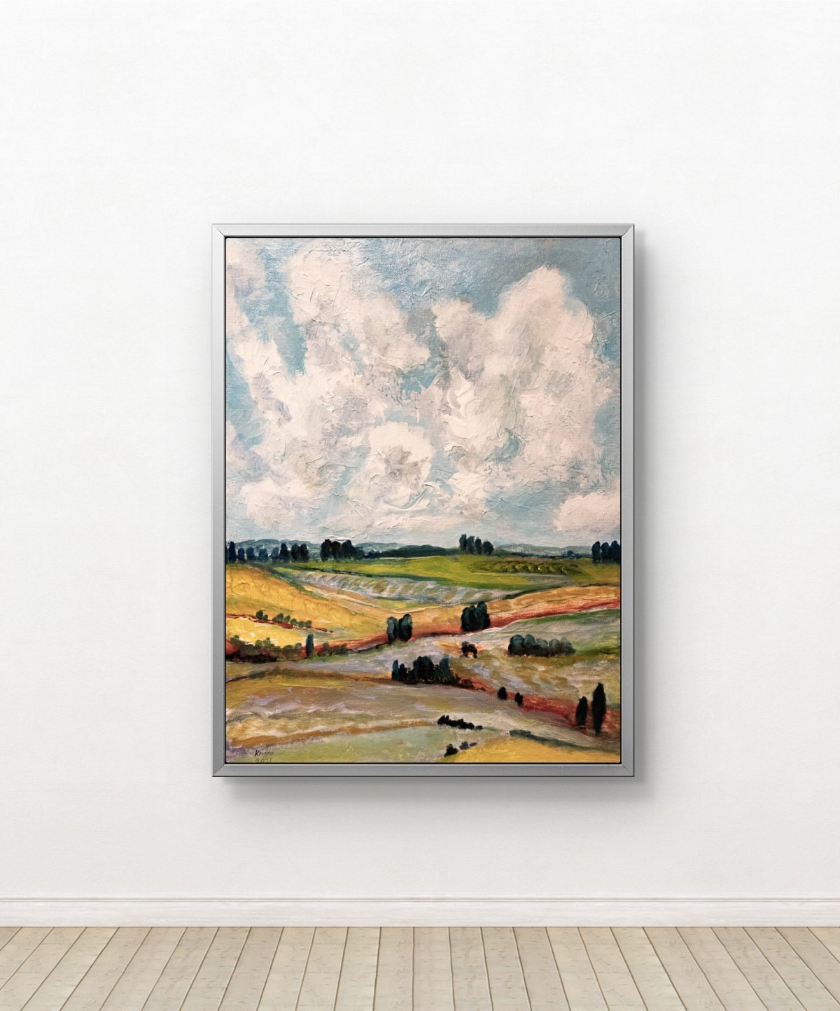 Les champs se succèdent, découpés en longues bandes de couleurs calmes, jaunes mûrs, verts assagis, terres roussies par le travail des hommes. On devine l’effort ancien, répété, humble. Les chemins rougeâtres serpentent sans but apparent, mais ils savent où ils vont, comme ces existences simples qui avancent sans bruit. De petits arbres sombres, plantés çà et là, tiennent tête au vent, droits et patients, témoins silencieux de saisons trop nombreuses pour être comptées.