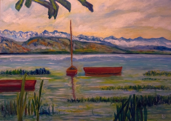 Sous un ciel d’ambre et de neige, le lac respire à peine — entre les herbes, deux barques rouges semblent attendre un retour ancien.