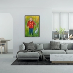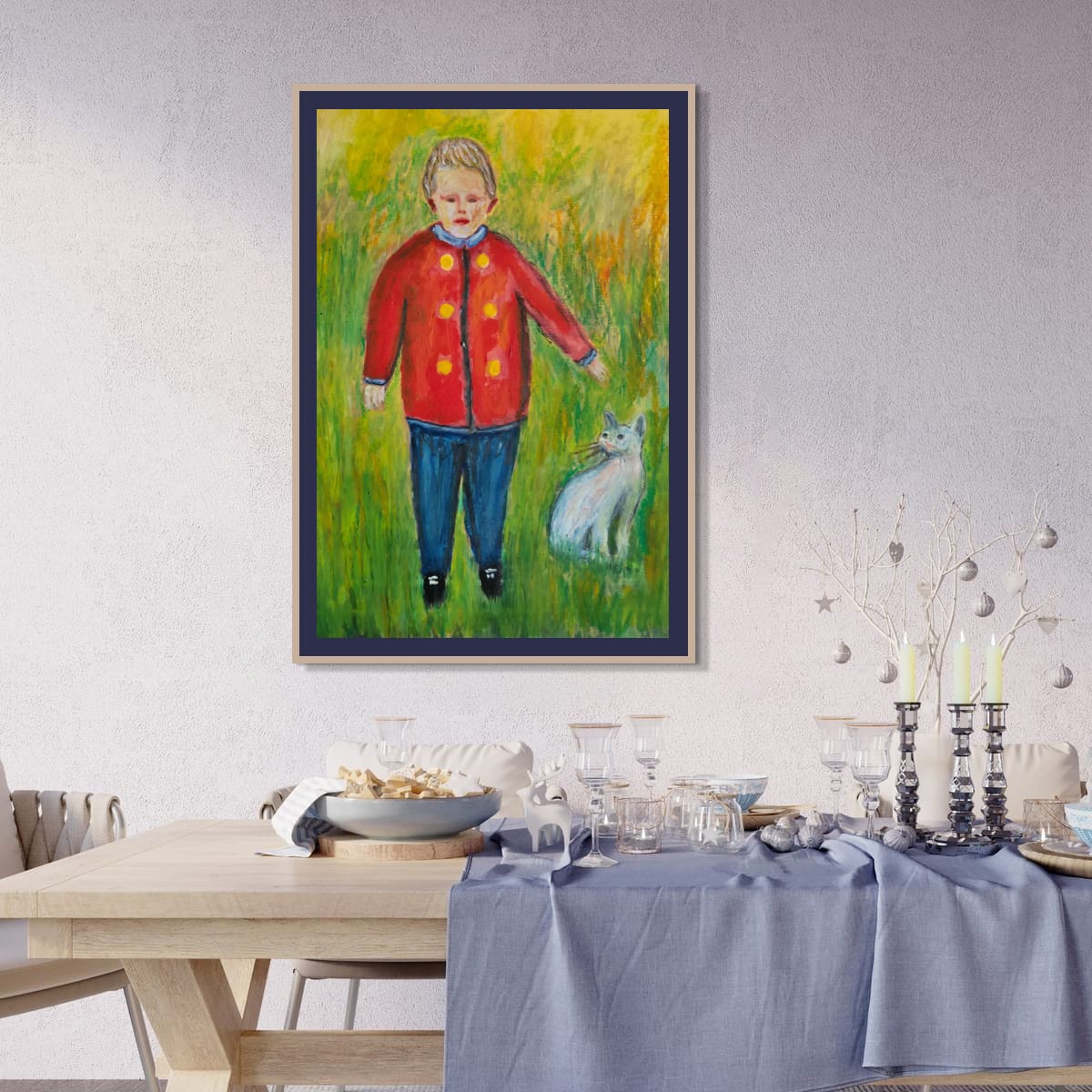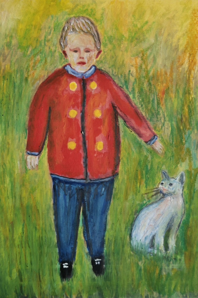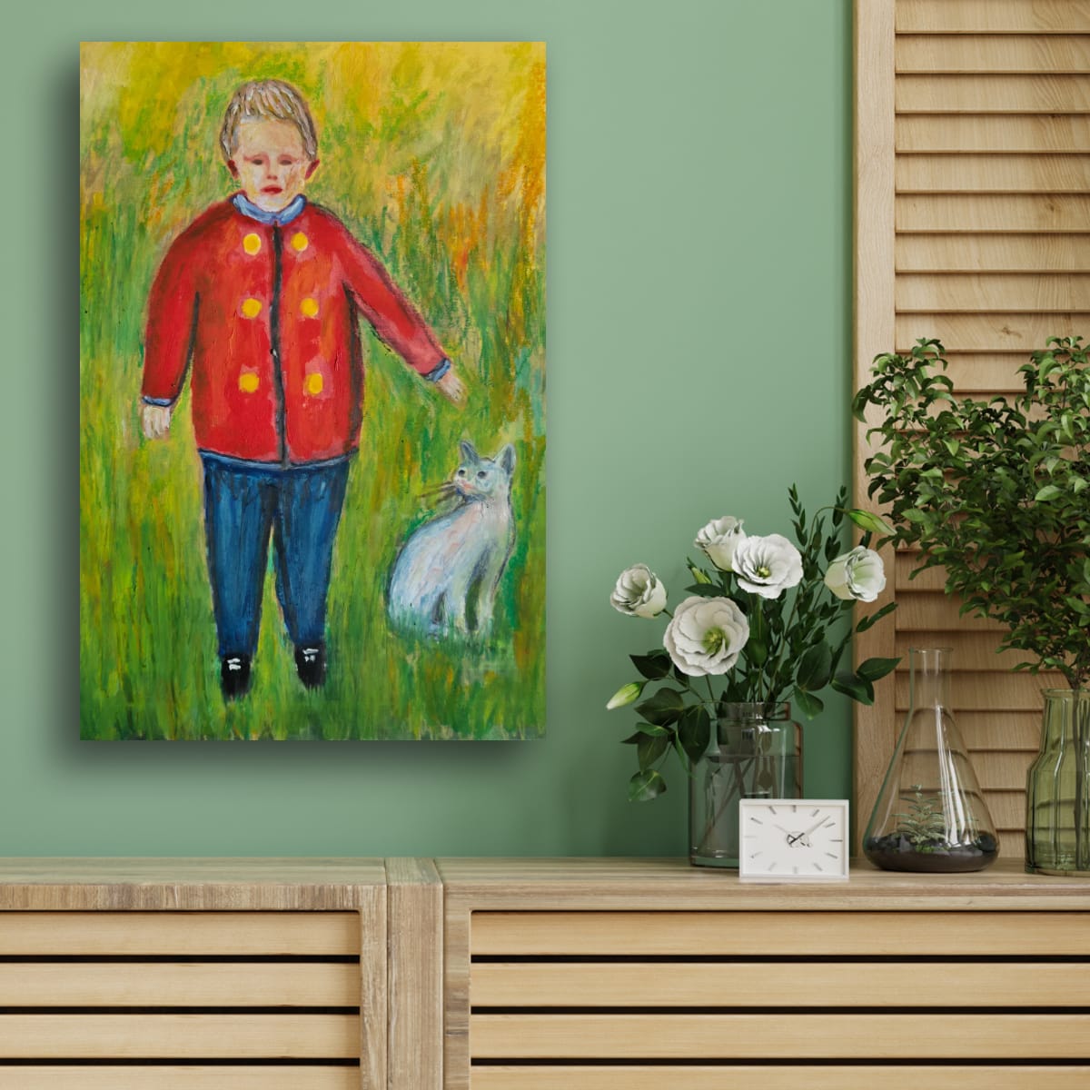 Son manteau rouge, constellé de boutons ronds, brûle doucement contre le vert mouvant, tel un cœur trop grand pour son corps. À ses côtés, un chat silencieux veille, gardien discret d’un monde où les mots n’ont pas encore appris à parler.