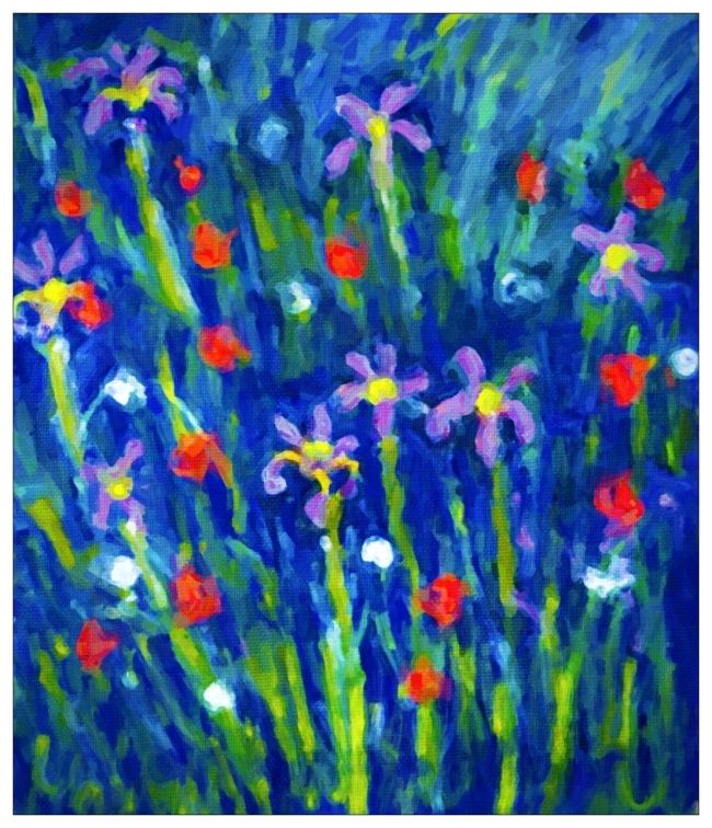 Les tiges, vertes lames d’air, tremblent au vent invisible ; le bleu s’y répand comme un chant de fraîcheur. Les corolles rouges éclatent, petites braises perdues dans la houle — un feu dans l’eau. Rien ne pèse : tout respire, tout danse. C’est le silence d’un matin d’été, quand le monde hésite encore entre le rêve et la clarté.