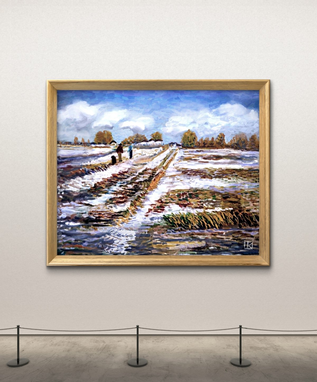 Deux silhouettes avancent lentement, accompagnées d’un chien, petites présences dans l’étendue ouverte. Le ciel bas, chargé de nuages, écrase doucement le paysage, tandis que l’hiver laisse encore ses traces.