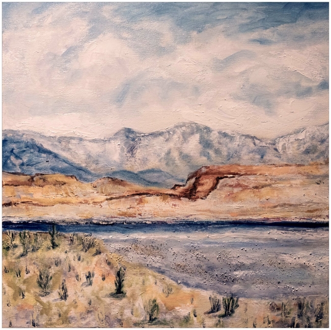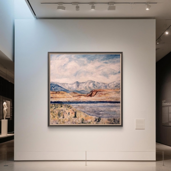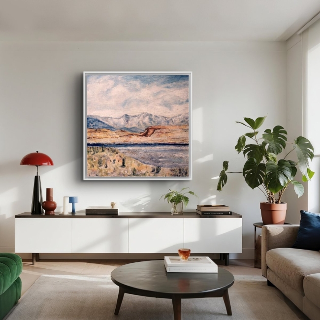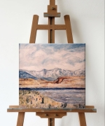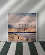La terre, striée d’ocres et de roux, s’étend jusqu’aux montagnes bleutées, où les neiges se fondent au ciel dans un voile de brumes claires.