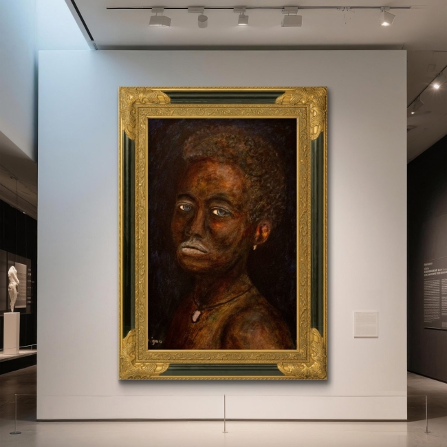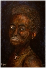 Son visage émerge lentement du noir, comme une flamme dans la nuit. La peau, profonde, mêle la terre et la lumière, modelée par le pinceau comme par la vie.