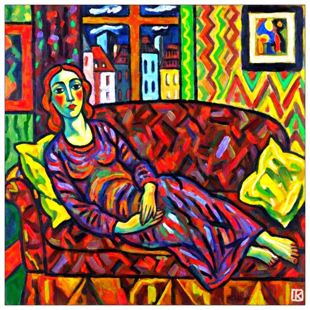 Sa robe, rivière de pourpre et de bleu, épouse les courbes du canapé comme une mélodie visuelle. Elle semble flotter entre deux mondes — celui du rêve et celui du motif. Le ciel derrière la fenêtre murmure des histoires de villes lointaines, tandis que les coussins jaunes veillent sur son sommeil éveillé. Chaque carreau du sol est une note, chaque motif un soupir. C’est un tableau qui ne se regarde pas : il se ressent.