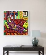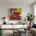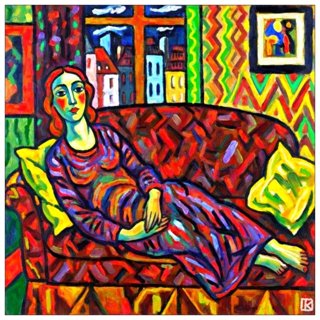 Dans une pièce où les murs chantent en zigzags et les couleurs dansent sans pudeur, une femme repose, sirène céleste aux cheveux de feu.