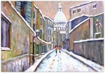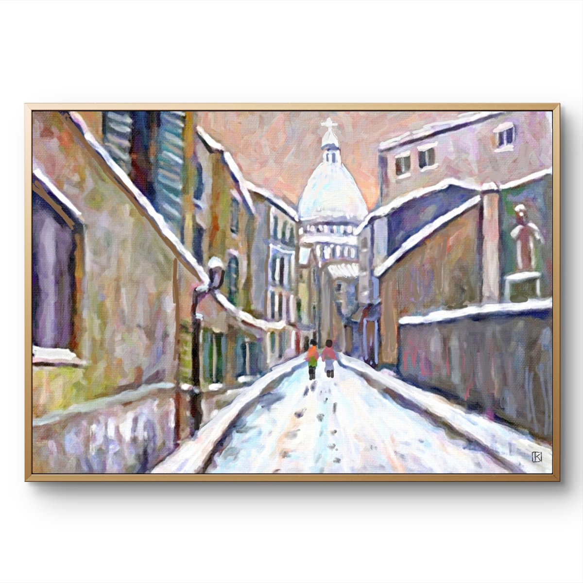 Tout ici est attente : celle d’un rire d’enfant qui éclate, d’une main gantée qui se serre, du soleil qui finira par mordre les ombres. Montmartre, dans sa blancheur fragile, se souvient — de l’enfance retrouvée, du temps qui ralentit, d’un instant suspendu où rien n’existe que le bruit léger de la neige sous les pieds.
