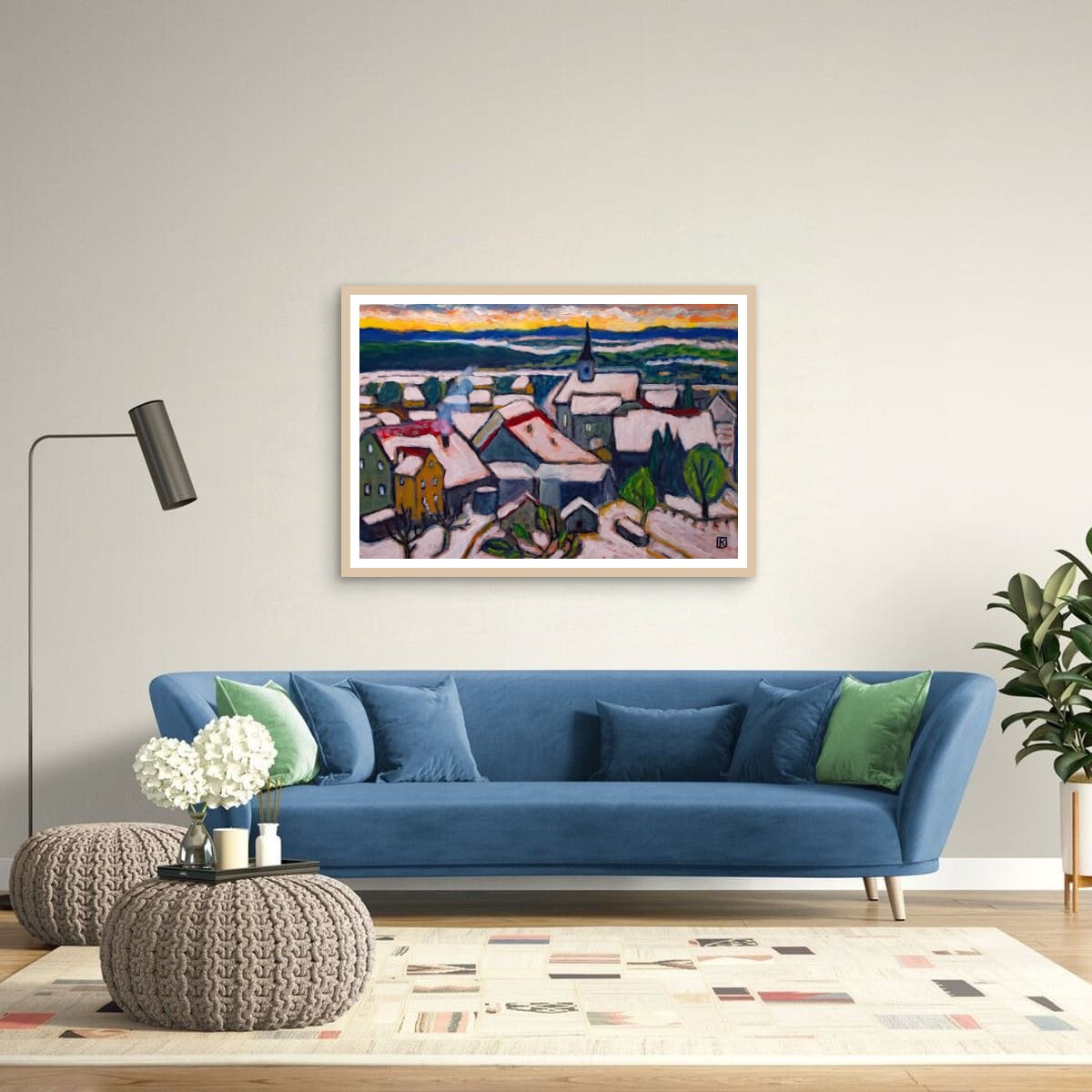 Au cœur des toitures rouges et pâles, le clocher veille, fine aiguille noire cousant la terre au ciel d’orange incandescent.