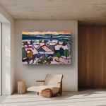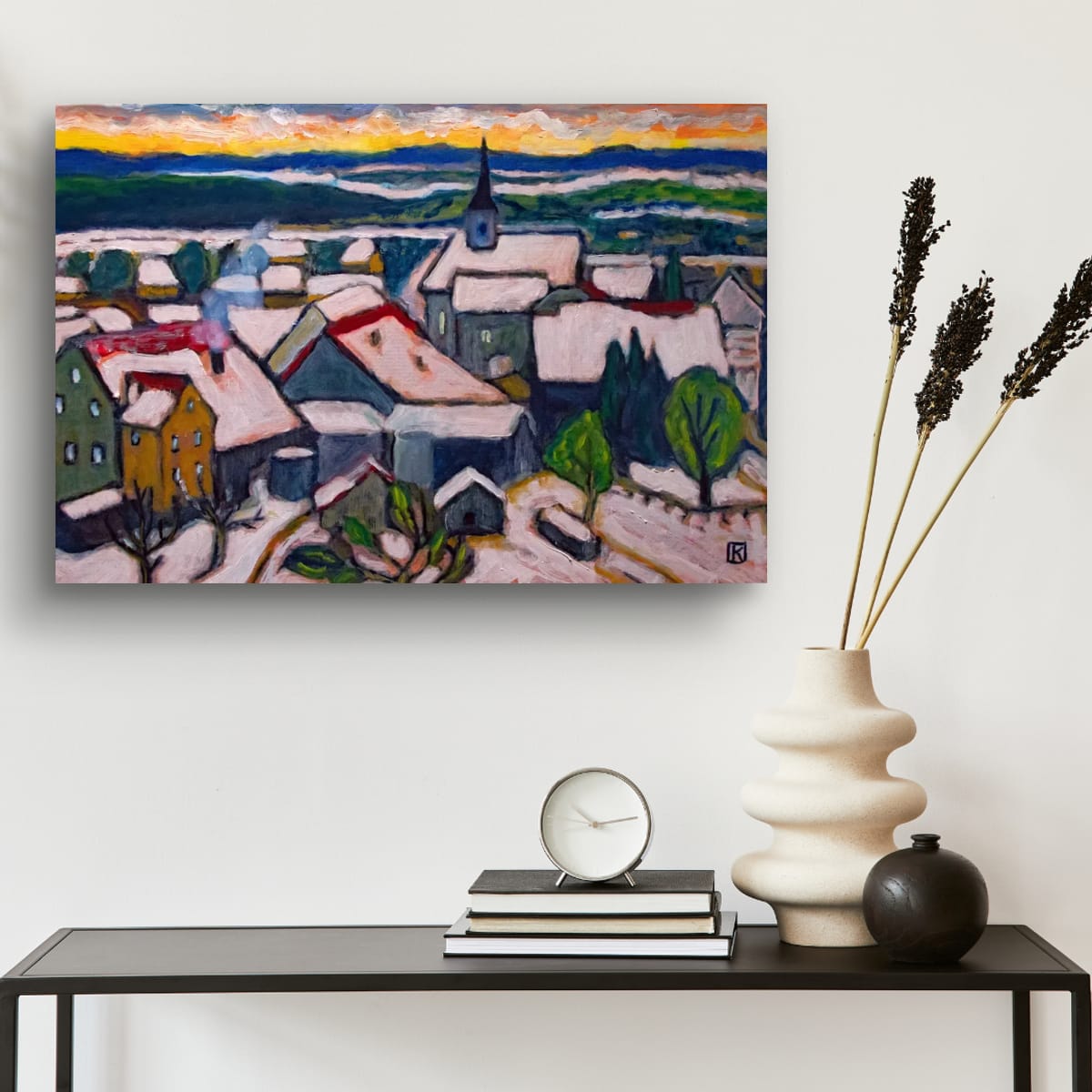 Une fumée légère s’élève des cheminées, comme si les foyers racontaient des histoires tièdes au froid de l’hiver.