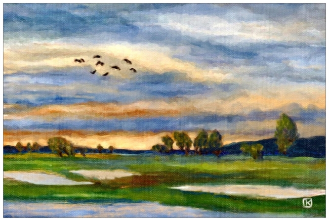 Les flaques étincellent comme des miroirs d’enfance, et les arbres, humides de lumière, veillent sur le calme revenu. Un vol d’oiseaux fend l’horizon — messagers de clarté. Tout semble suspendu entre deux souffles : celui de la pluie, celui du renouveau.