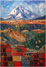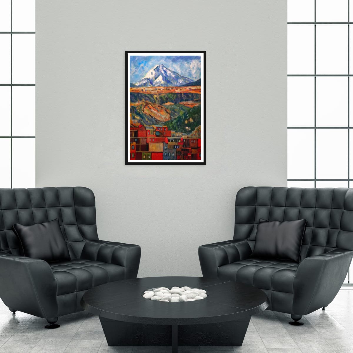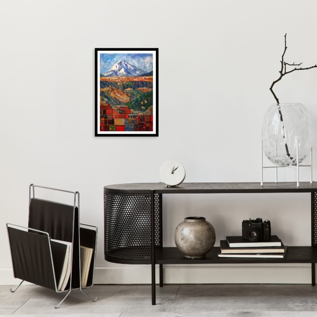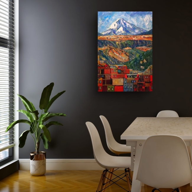 Au pied de la grande montagne bleue, la ville s’empile comme une mosaïque de braises et de couleurs.