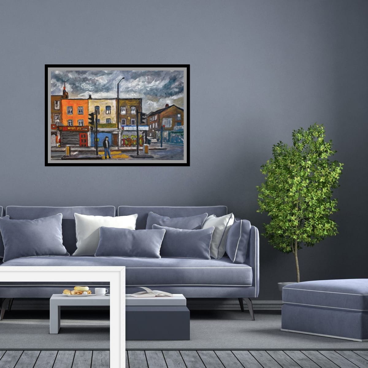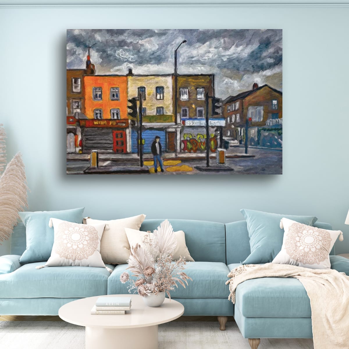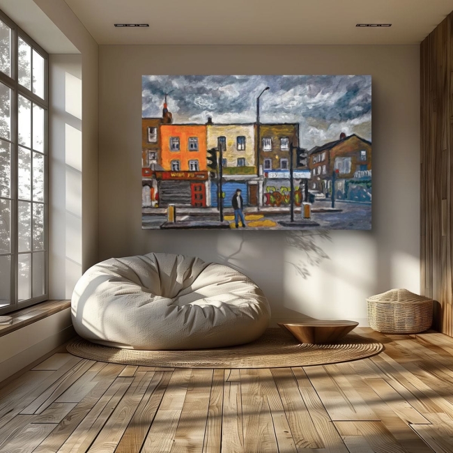 Les façades colorées s’alignent comme des notes chaudes sur une portée de briques, éclairant la rue sous un ciel chargé de nuages.
