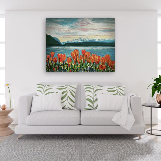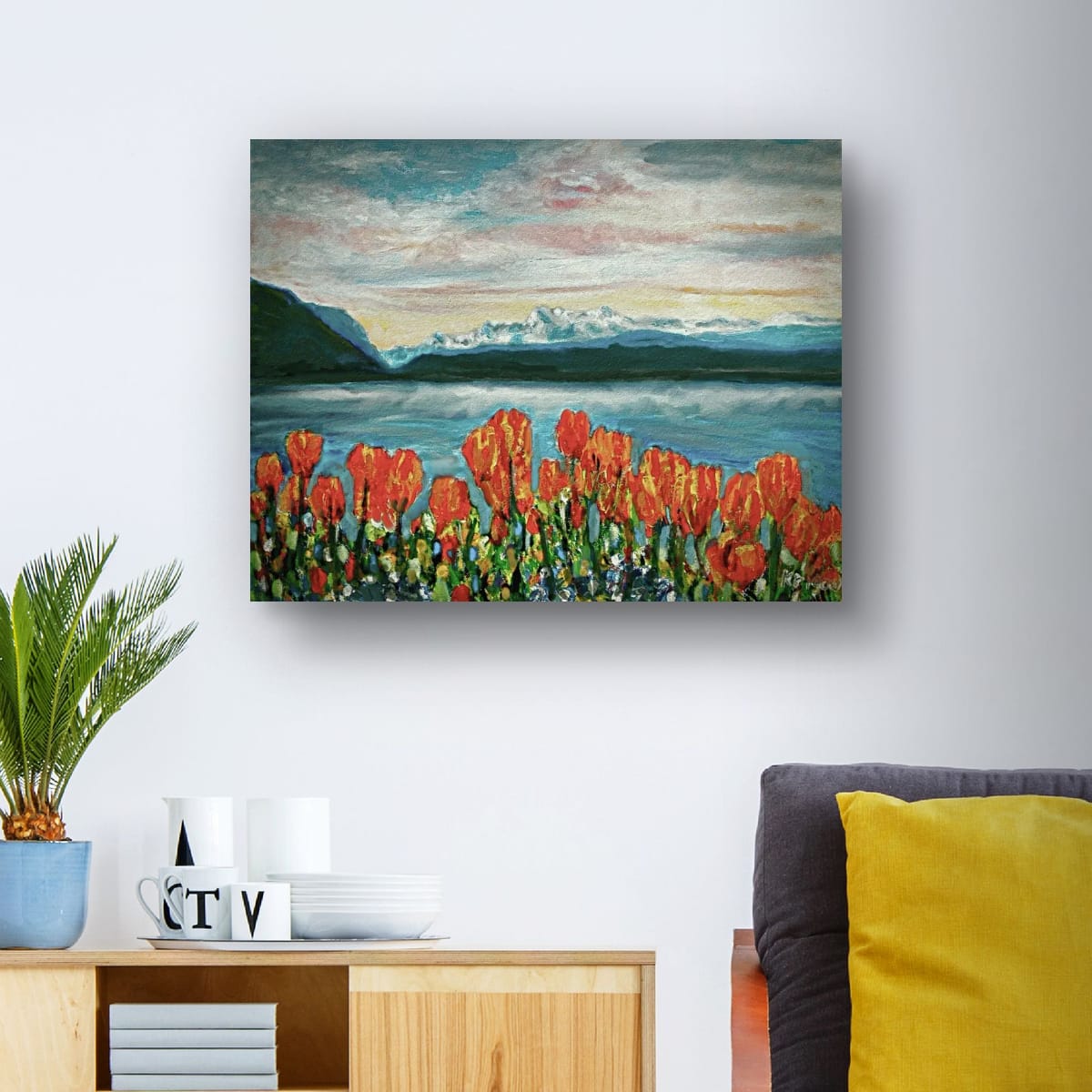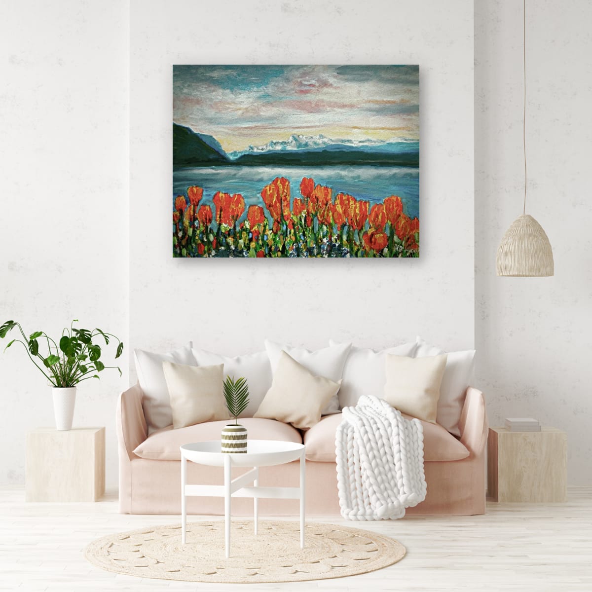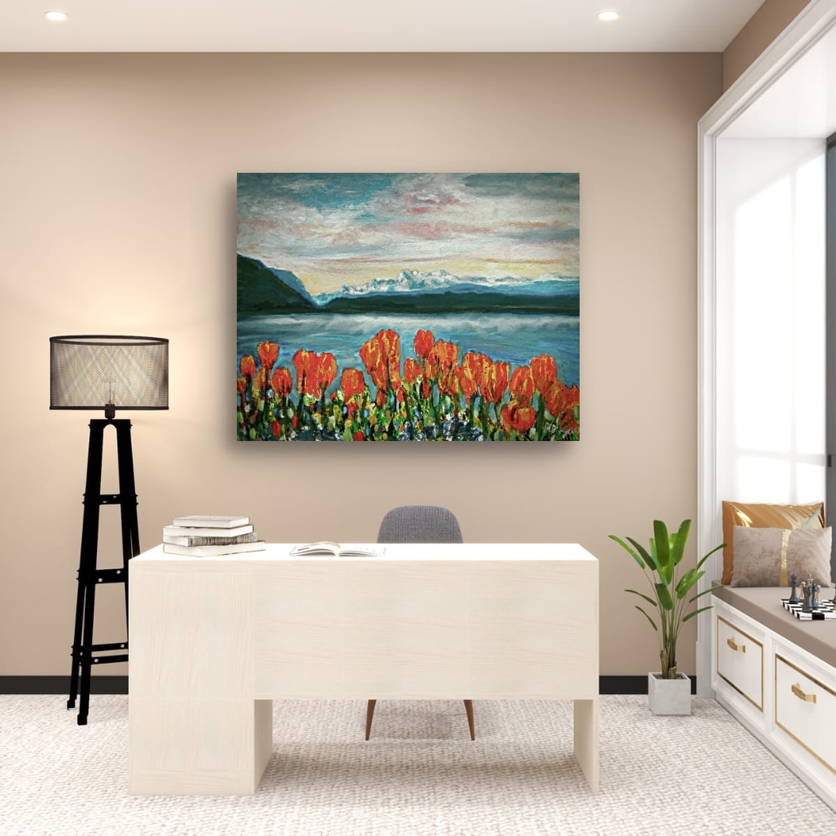 Au premier plan, une flambée de tulipes rouges se dresse comme un chœur ardent, vibrant contre la fraîcheur du paysage.