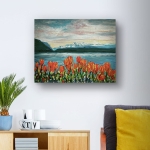 L’ensemble compose une scène où la chaleur des fleurs dialogue avec la sérénité alpine, comme une conversation entre feu et silence.