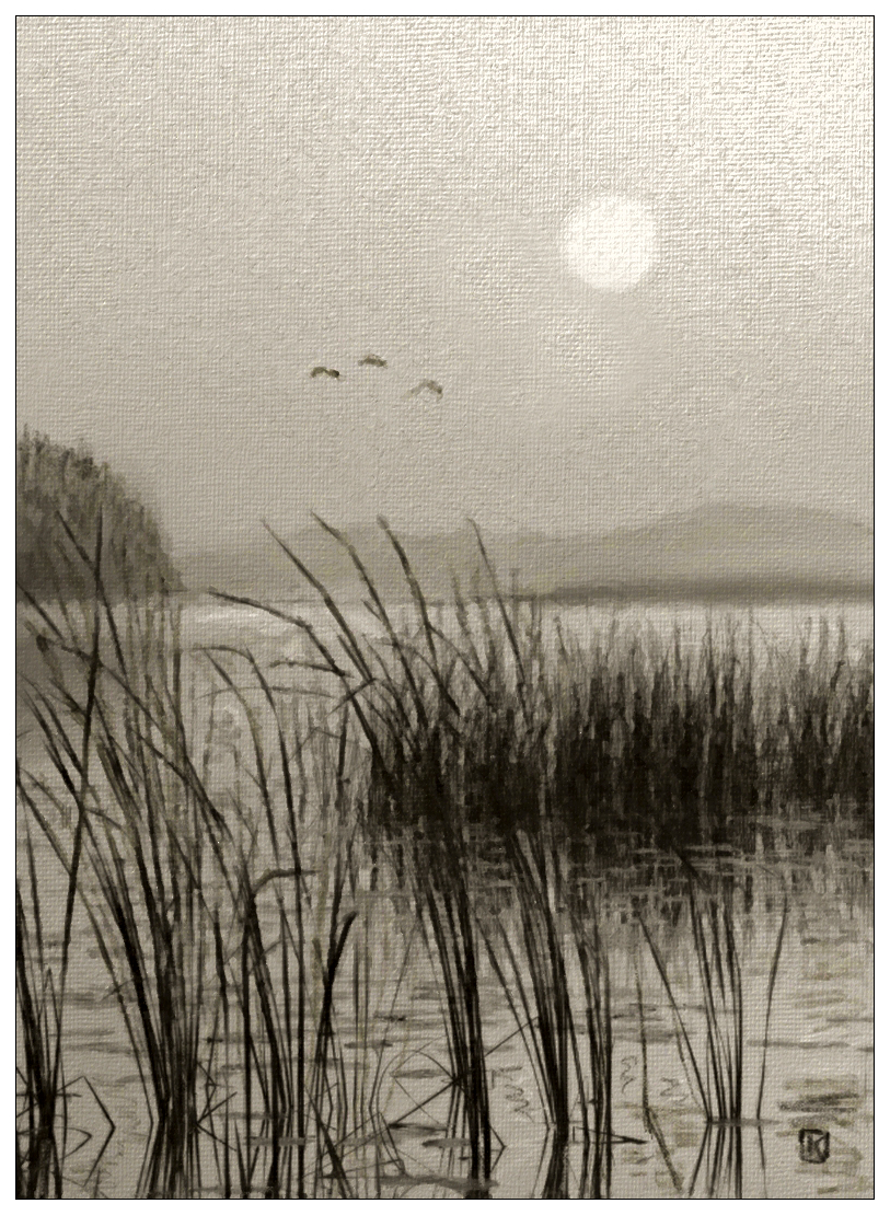 Dans la pâleur d’un soleil sans éclat, le monde semble retenu dans un souffle. Les roseaux, fins comme des prières, tracent des calligraphies d’encre sur l’eau dormante.