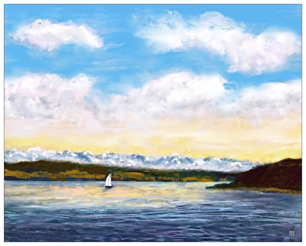Sous un ciel vaste, lavé d’azur et d’or, un voilier solitaire glisse comme une pensée légère.
