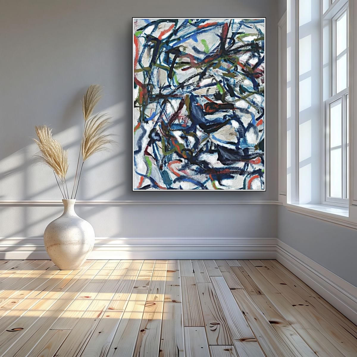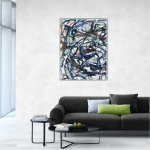 Les traits verts surgissent tels des pousses imprévisibles, se mêlant aux bleus profonds qui rappellent l’ombre humide des sous-bois. Certaines formes ressemblent à des lianes, d’autres à des tiges brisées ou à des feuilles en train d’éclore dans l’espace de la toile.