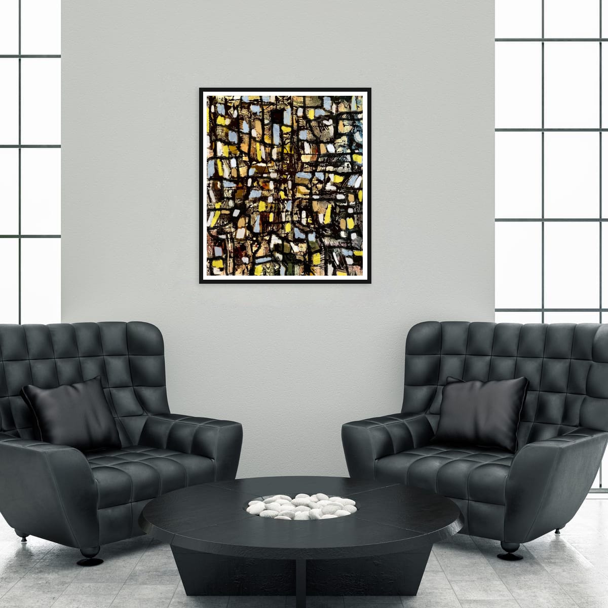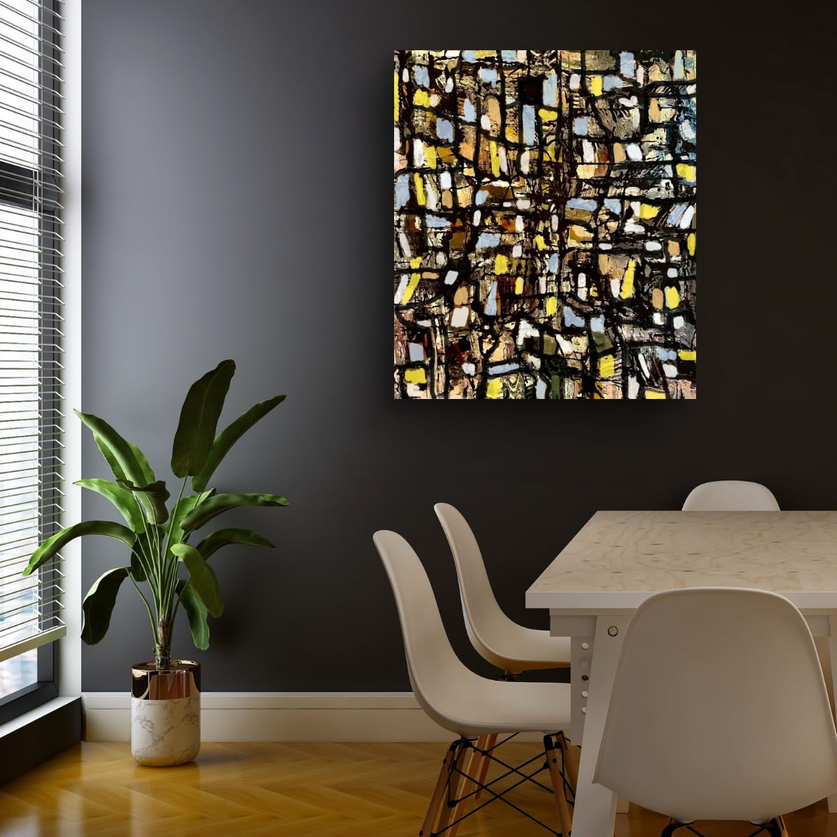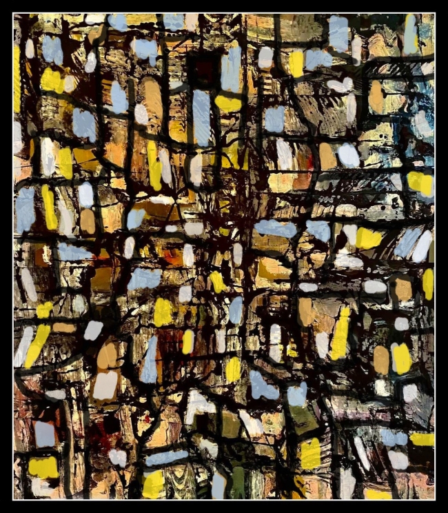 Des éclats pâles et dorés scintillent, tels des fenêtres allumées dans un labyrinthe vivant. La matière bruisse, griffée, chargée de mémoires enfouies et de gestes impatients. Au cœur du chaos, une harmonie fragile pulse, comme un battement discret sous la surface.