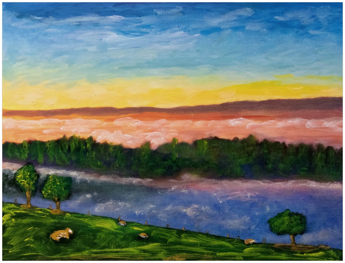 La rivière glisse sans hâte, miroir assagi où le jour dépose ses dernières couleurs. Sur la colline, les arbres veillent, ponctuant l’herbe de vert profond et de formes patientes. Tout semble suspendu, retenu dans l’instant fragile où le monde hésite entre lumière et nuit.